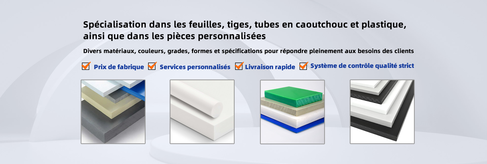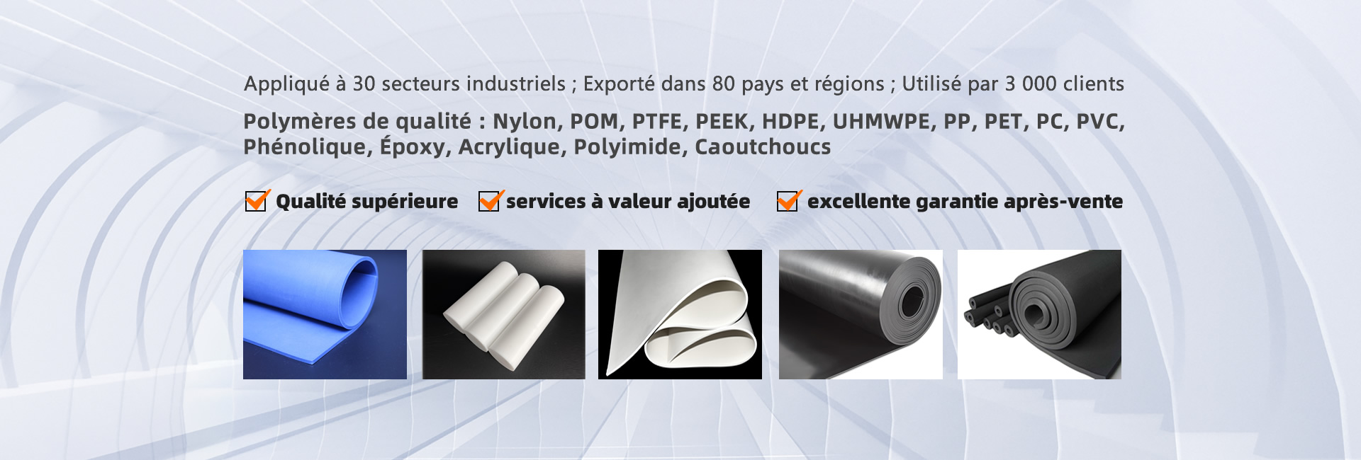 Produits polymères tels que caoutchoucs SBR, caoutchoucs EPDM, feuilles de nylon, tiges de nylon, tubes de nylon, tiges PA, feuilles PA, feuilles PC, feuilles POM, tiges POM, feuilles PP, tiges PP, feuilles PET, tiges PET, feuilles PVC, feuilles PTFE, tiges PTFE, tubes PTFE, feuilles PEEK, feuilles HDPE, tiges HDPE, feuilles UHMWPE, tiges UHMWPE, feuilles de coton phénolique, tiges de coton phénolique, feuilles de verre époxy, feuilles acryliques, et ainsi de suite.