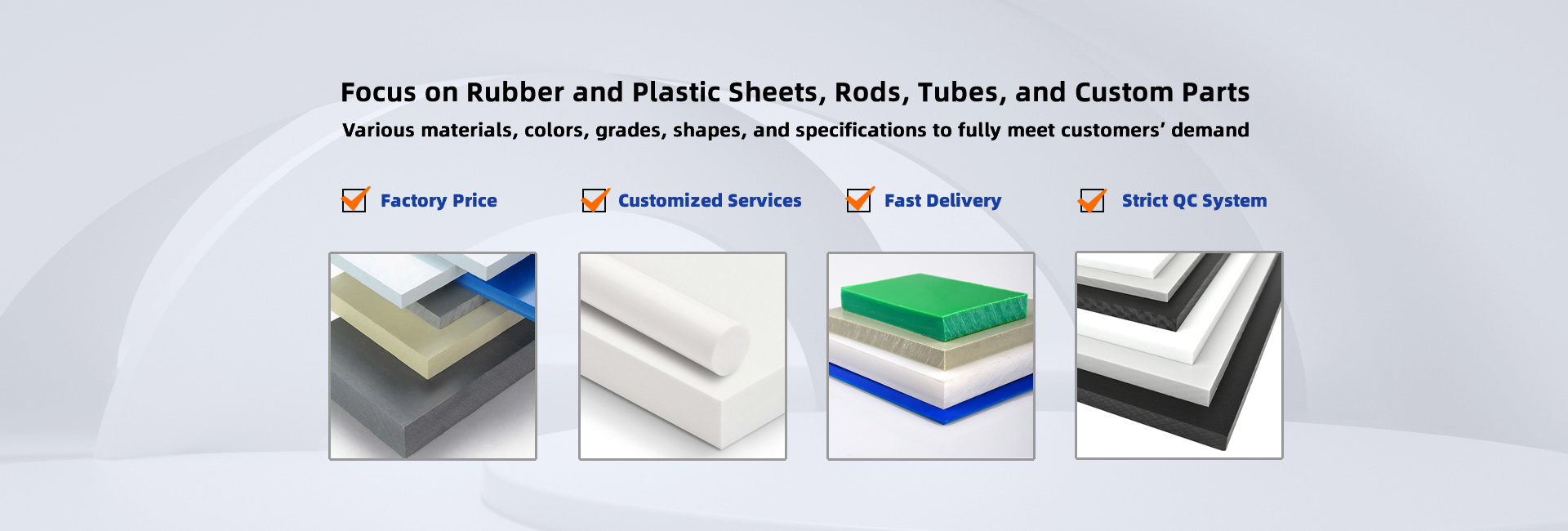 Polymer Products such as SBR Rubbers, EPDM rubbers, Nylon Sheets, Nylon Rods, Nylon Tubes, PA Rods, PA Sheets, PC Sheets , POM Sheets, POM Rods, PP Sheets, PP Rods, PET Sheets, PET Rods, PVC Sheets, PTFE Sheets, PTFE Rods, PTFE Tubes, PEEK Sheets, HDPE Sheets, HDPE Rods, UHMWPE Sheets, UHMWPE Rods, Phenolic Cotton Sheets, Phenolic Cotton Rods, Epoxy Glass Sheets, Acrylic Sheets, and so on.